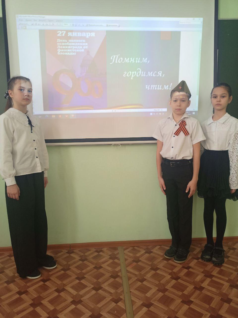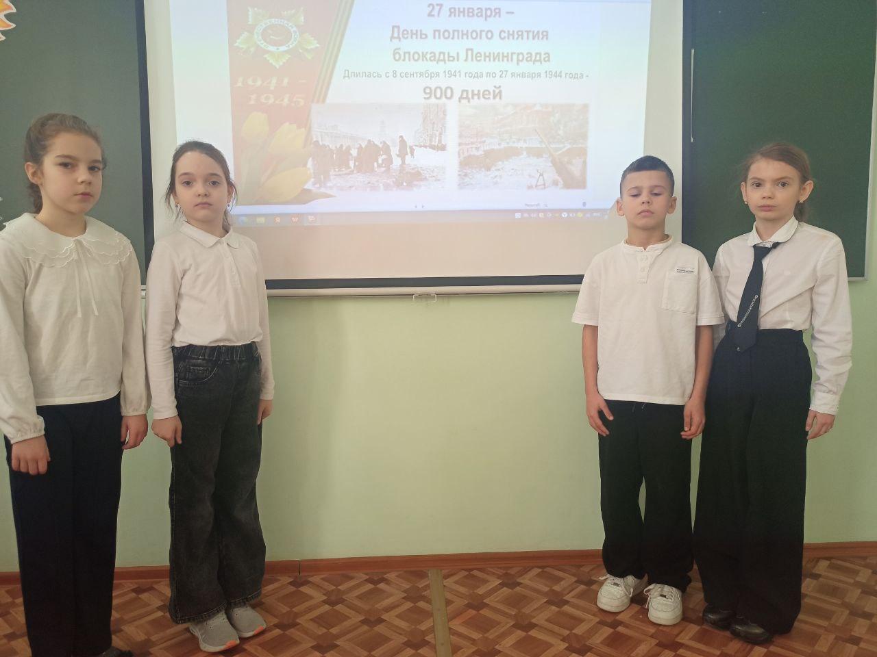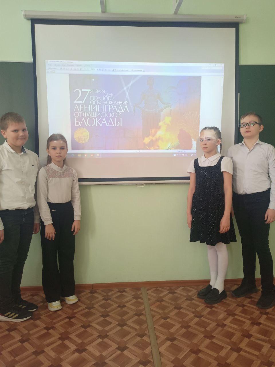 В рамках проведения мероприятий "Блокаде Ленинграда посвящается..." учащиеся при поддержке классного руководителя - Дуркиной Татьяны Юрьевны подготовили выразительное чтение стихотворений, спели песню, а также показали инсценировку сценки о жизни детей Ленинграда в период блокады.